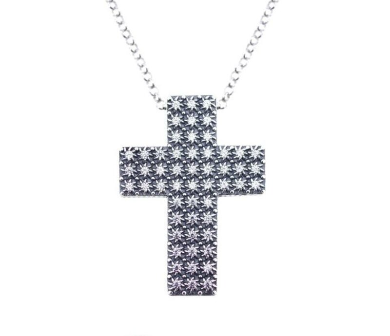 La Collana Con Croce S’ave Maria è realizzata in argento 925 ha inciso dietro la scritta “S’ave Maria”.