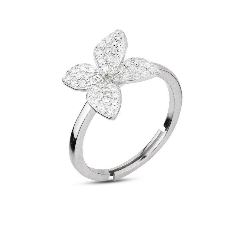 Anello contrarié in argento con fiore di pavè di zirconi centrale.Materiale: argentoProduzione: realizzato in ItaliaMisura: regolabile dalla 13 alla 17.