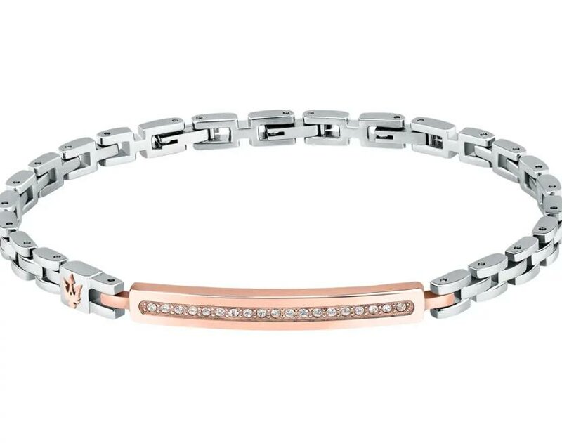 Genere: Uomo, Misura: 18|3.5, Colore: Silver, Rose-gold, Materiale: Acciaio, Cristalli, Peso: 18,600 gr, Pietra: Cristallo, Colore pietra: Bianco, Certificato di autenticità: Sì.