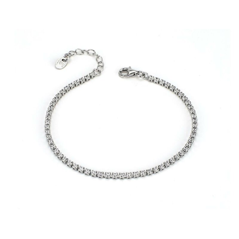 Bracciale tennis rodiato con zirconi bianchi.Materiale: argentoProduzione: realizzato in ItaliaMisura: lunghezza cm 16,5, estendibile fino a cm 19,5Chiusura: moschettoneGaranzia: 2 anni