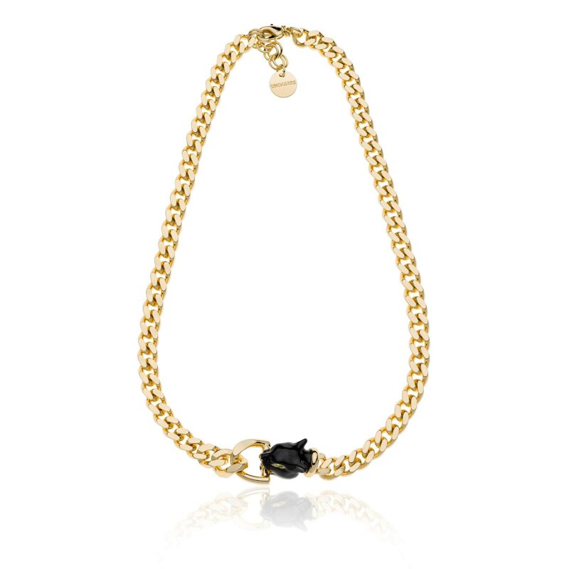 Collana in catena grumetta diamantata con centrale a testa di pantera e smalto nero. Misura 41,50 cm. L'iconico tema animalier affascina e sorprende in questa collana dal design importante e grintoso.