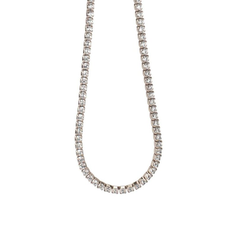 Collana tennis rodiata con zirconi bianchi.Materiale: argentoProduzione: realizzato in ItaliaMisura: lunghezza cm 38, estendibile fino a cm 43,5Chiusura: moschettoneGaranzia: 2 anni