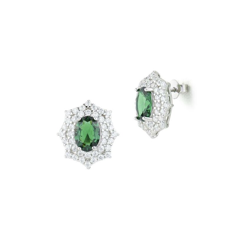 Orecchini rodiati con cristallo di colore verde e corona di zirconi bianchi.