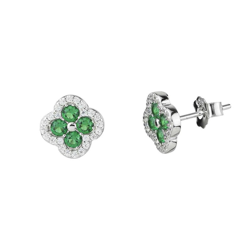 Orecchini a lobo in argento rodiato con quadrifoglio di pavè di zirconi e cristalli verdi.