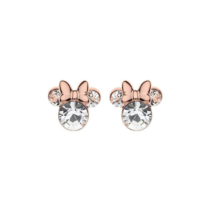 Orecchini a lobo della collezione Disney Preziosi Mickey Mouse da donna e da bambina. Colore: oro rosa. Gli orecchini sono in argento 925‰ rosé a forma di Minnie impreziositi da zirconi bianchi e da un fiocchetto, segno distintivo di Topolina. Chiusura a perno.