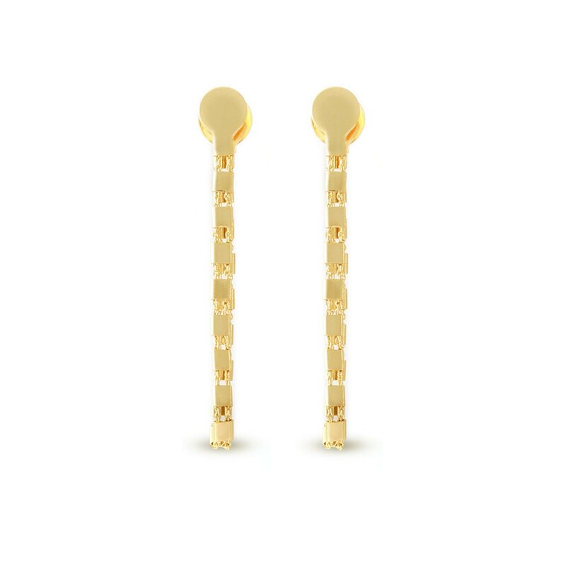 Orecchini lunghi in catena sottile con quadratini, bagno in oro 24kt. Il cerchietto nella parte finale permette di indossarli lunghi o corti facendo passare il foro tra perno e far fallina. Questi splendidi orecchini sono un accessorio dall'eleganza unica e raffinata per risplendere in ogni occasione. Portali corti per un look semplice e luminoso, lunghi per sedurre e catturare ogni sguardo.